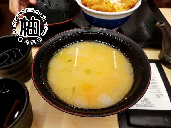 最後是點丼飯加購的豬肉味噌湯,裡面有豬肉片、蒟蒻片、紅蘿蔔與白蘿蔔等豬肉味噌湯的基本配備,湯微鹹微甜很好喝